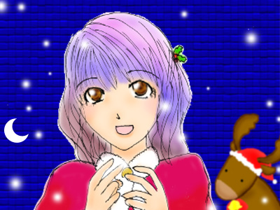 まこな 「できるだけ☆なんとなく☆クリスマス」を 自分内キーワードに設定。 雪っぽさだとか、赤い服(サンタのイメージ)とか なんかすべてにおいて微妙な感じに…… バックが殺風景だからとマウスで描いたトナカイが このイラストでの一番のお気に入りです。 髪のグラデーションをきれいにつけたかった………。 要修行