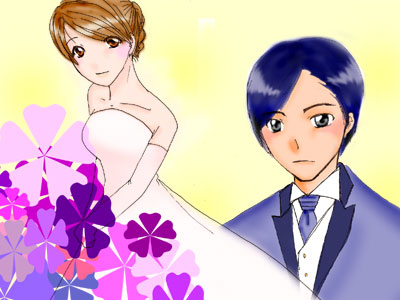 まこな 6月=ジューンブライドって短絡的な思いつきと 妹の結婚式の準備手伝ってるのと重なって こういうのになりました。 改めて見直すと新郎の色塗りがひどい…。 これからも精進します。